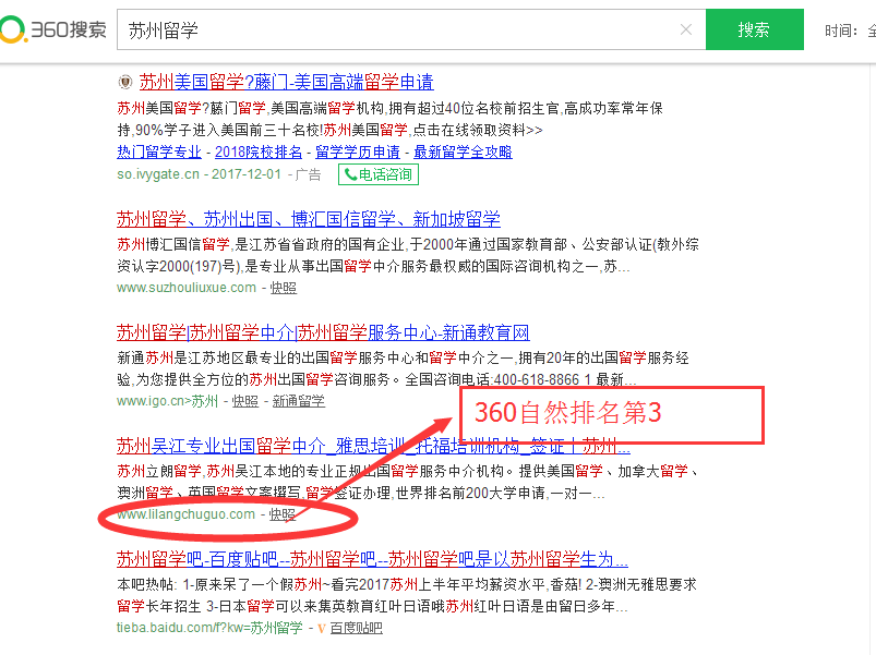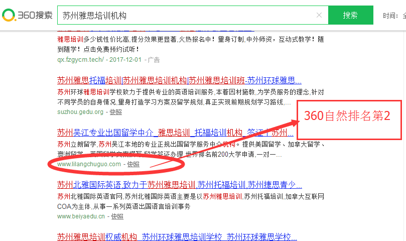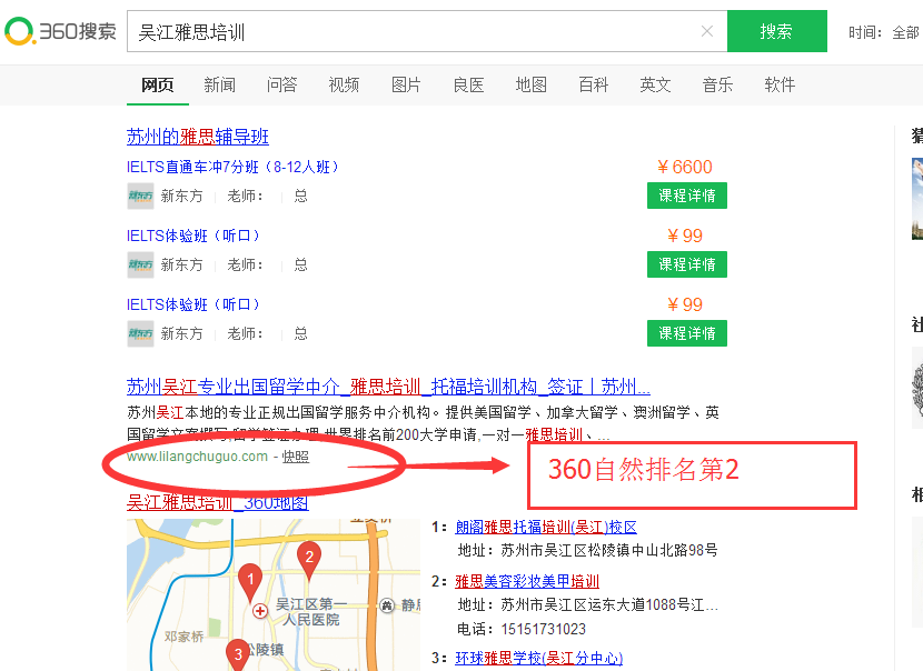 360seo自然排名:三个月之内苏州留学、苏州雅思培训、苏州托福培训、吴江留学、吴江雅思培训、吴江托福培训多个相关词均优化360首页。其中吴江地区相关词均优化到第一名。