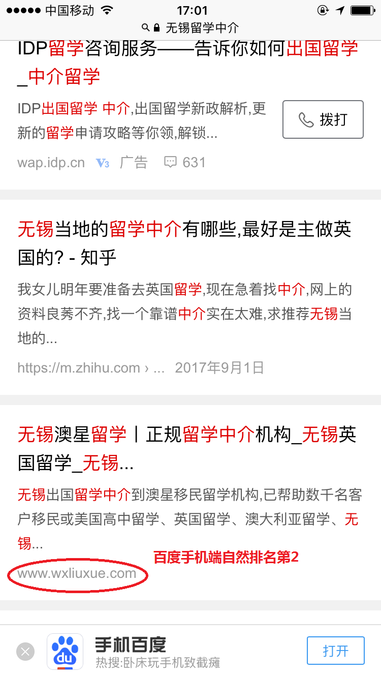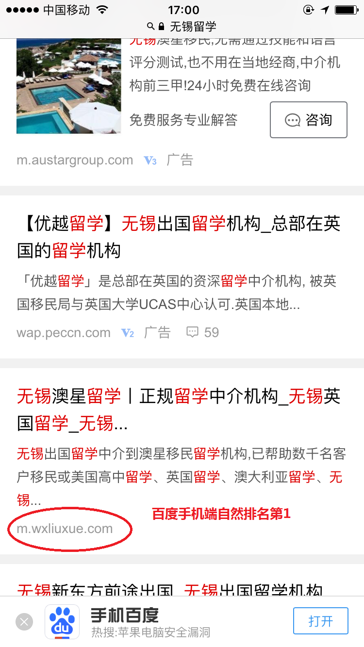 无锡网站优化案例:澳星留学,百度电脑端、百度手机端、360电脑端、360手机端相关关键词超过90%自然排名第一。地区留学客户引流量巨大。